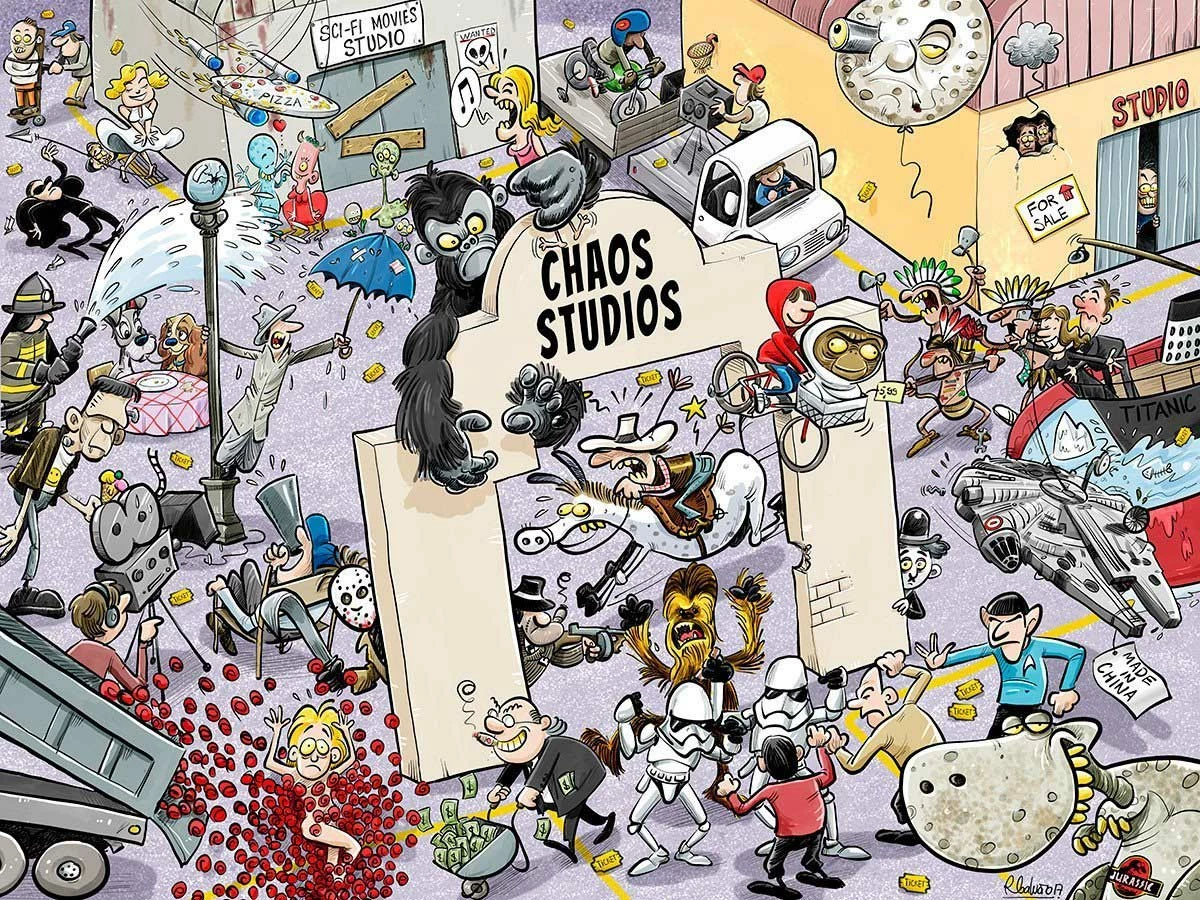 Exclusive to All Jigsaw Puzzles, Chaos At The Movies is a jigsaw in the hilarious and bestselling Chaos series. Mayhem reigns at the Chaos Movie Studios! Star Wars and Star Trek are having a fight, the cowboys and Indians are definitely not getting on and King Kong is really not helping. See how many classic movies you can spot given the hilarious Chaos treatment!