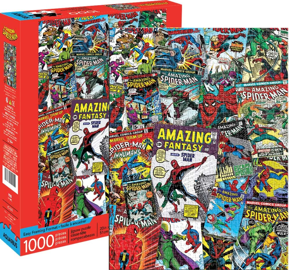 UNLOCK YOUR INNER SUPERHEROβ¦ Swing into the Marvel Universe with the friendly neighborhood Spiderman, & rise to the challenge of completing this 1000 piece puzzle featuring classic comic book covers of the Amazing Spider-Man. Puzzle measures 20×28 in
