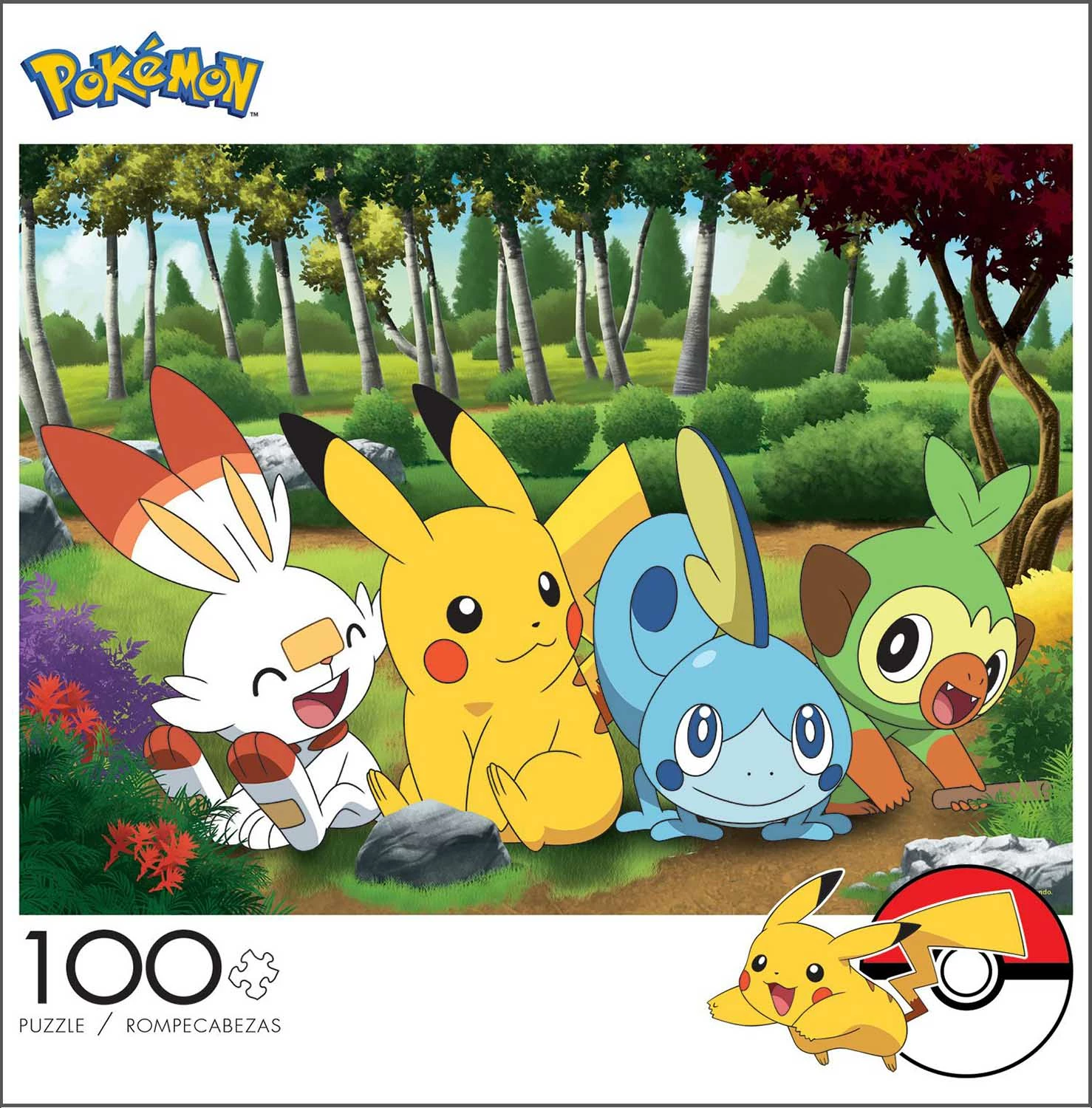 This 100-piece Pokémon jigsaw puzzle features Pikachu, Grookey, Scorbunny, and Sobble relaxing in the forest. You can find these fire, water, grass, and electric type Pokémon in the Galar region! Which one would you choose?!