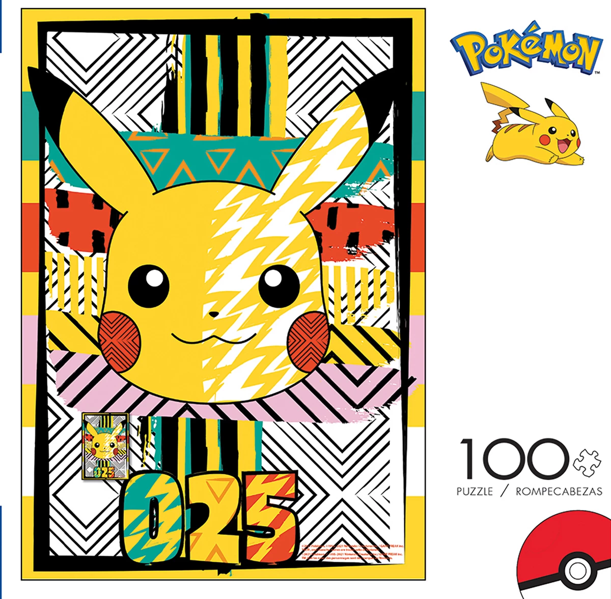 This 100-piece Pokémon jigsaw puzzle features the face of #025 Pikachu, surrounded by a fun and engaging pattern. Piece together this smiling Electric-type Pokémon standing in front of a wall of lively and colorful designs.