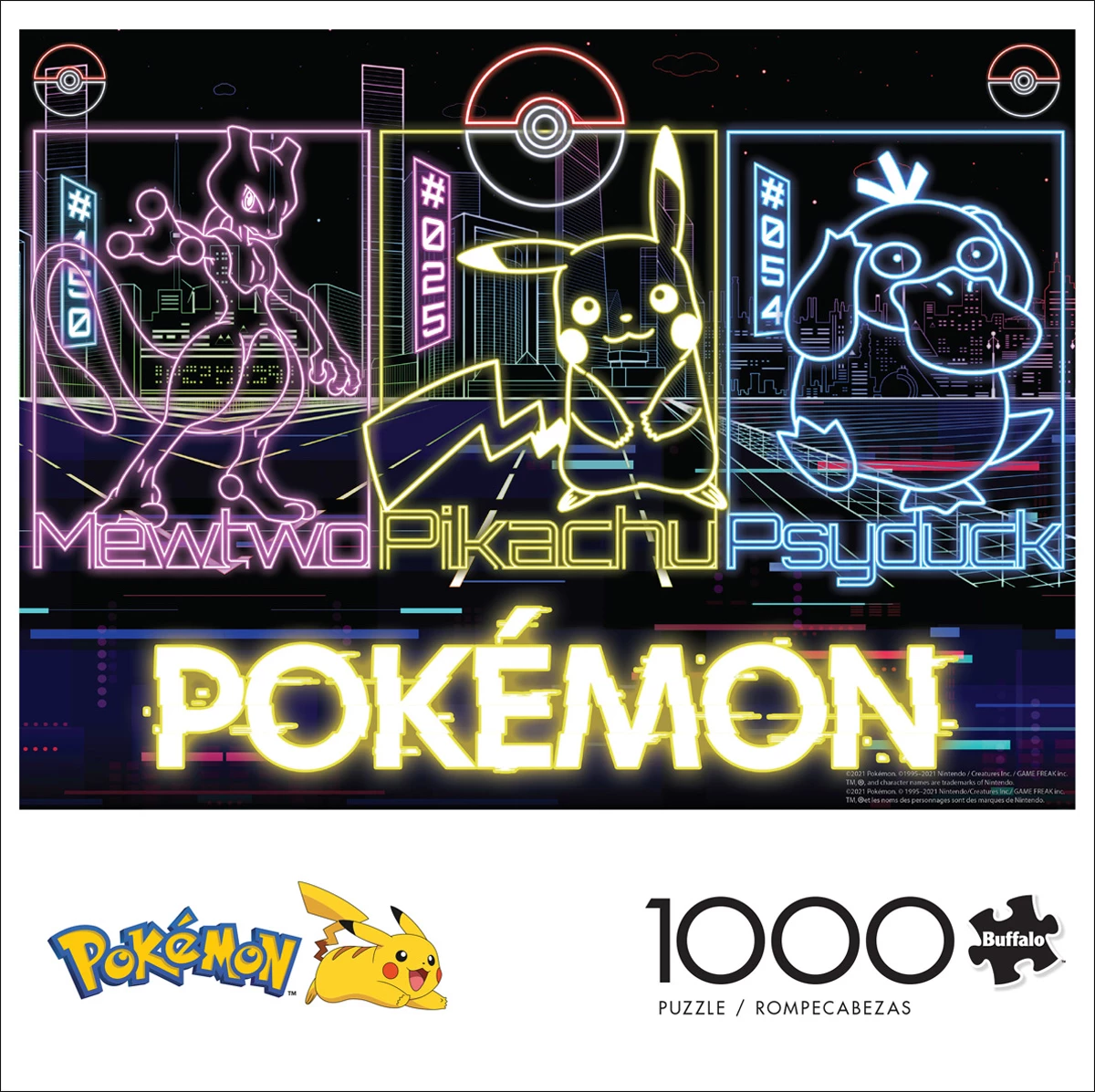 This 1000-piece PokΓ©mon jigsaw puzzle features Mewtwo, Pikachu, and Psyduck in neon lights! The three PokΓ©mon are shown in front of a virtual city skyline. Surrounding the PokΓ©mon are neon PokΓ© Balls and bright and bold yellow lettering that says PokΓ©mon.Β