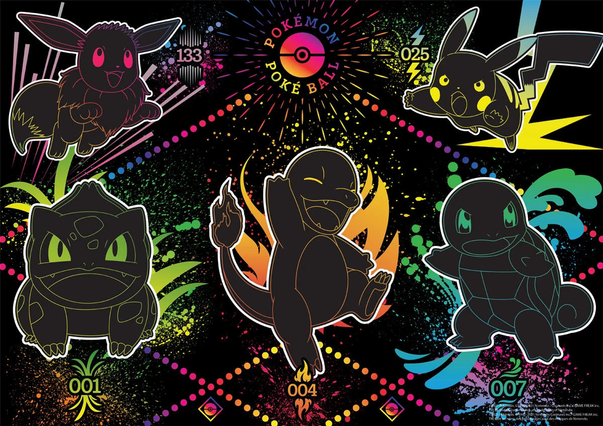 This 1000-piece PokΓ©mon jigsaw puzzle features a collection of Kanto region PokΓ©mon in a style reminiscent of rainbow scratch art. Each PokΓ©mon sits in front of a striking background that matches their type. Piece together the starter PokΓ©mon; Bulbasaur, Squirtle, and Charmander along with Pikachu and Eevee in this colorful collage.Β