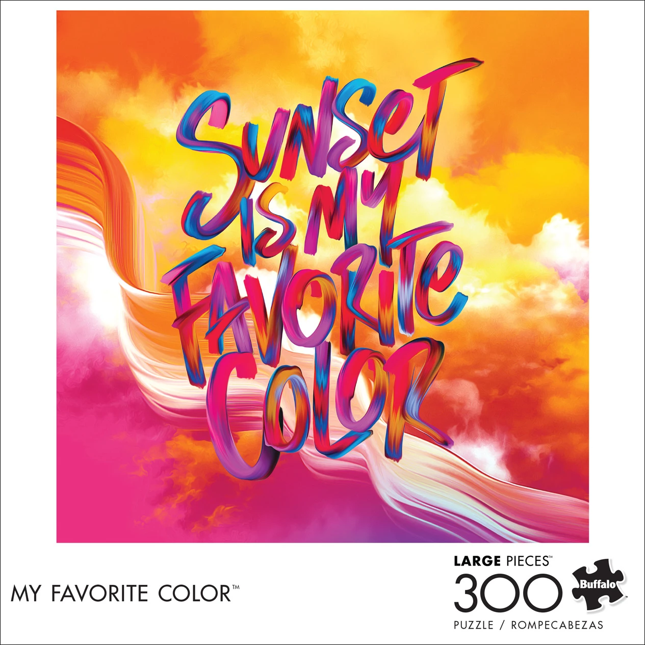 This 300-large piece puzzle, My Favorite Color, is part of the Art of Play collection by Buffalo Games. Piece together the words βSunset is my favorite colorβ depicted in the warm colors of a sunset itself. Red, yellow, orange, and purple hues fill this calm yet fiery puzzle.