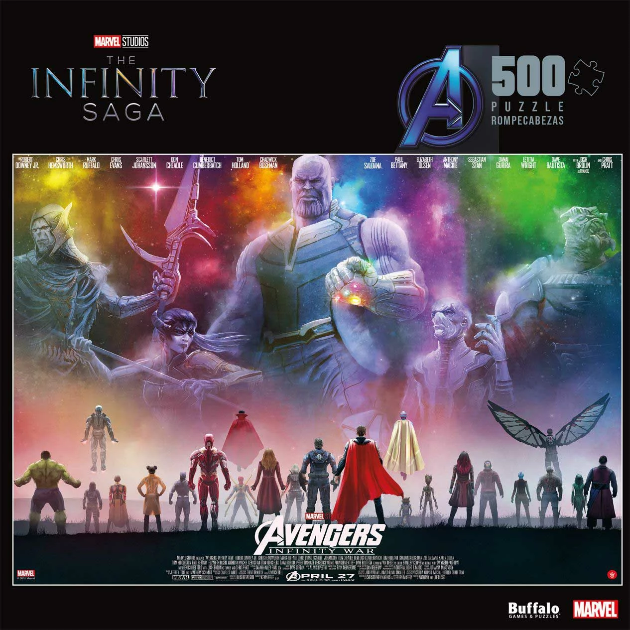 This 500-piece Marvel Jigsaw puzzle is based on the theatrical release poster for Avengers: Infinity War. It features all your favorite Avengers as they prepare to face-off with Thanos and his minions. The background features cosmic colors representing the colors of the 6 infinity stones.