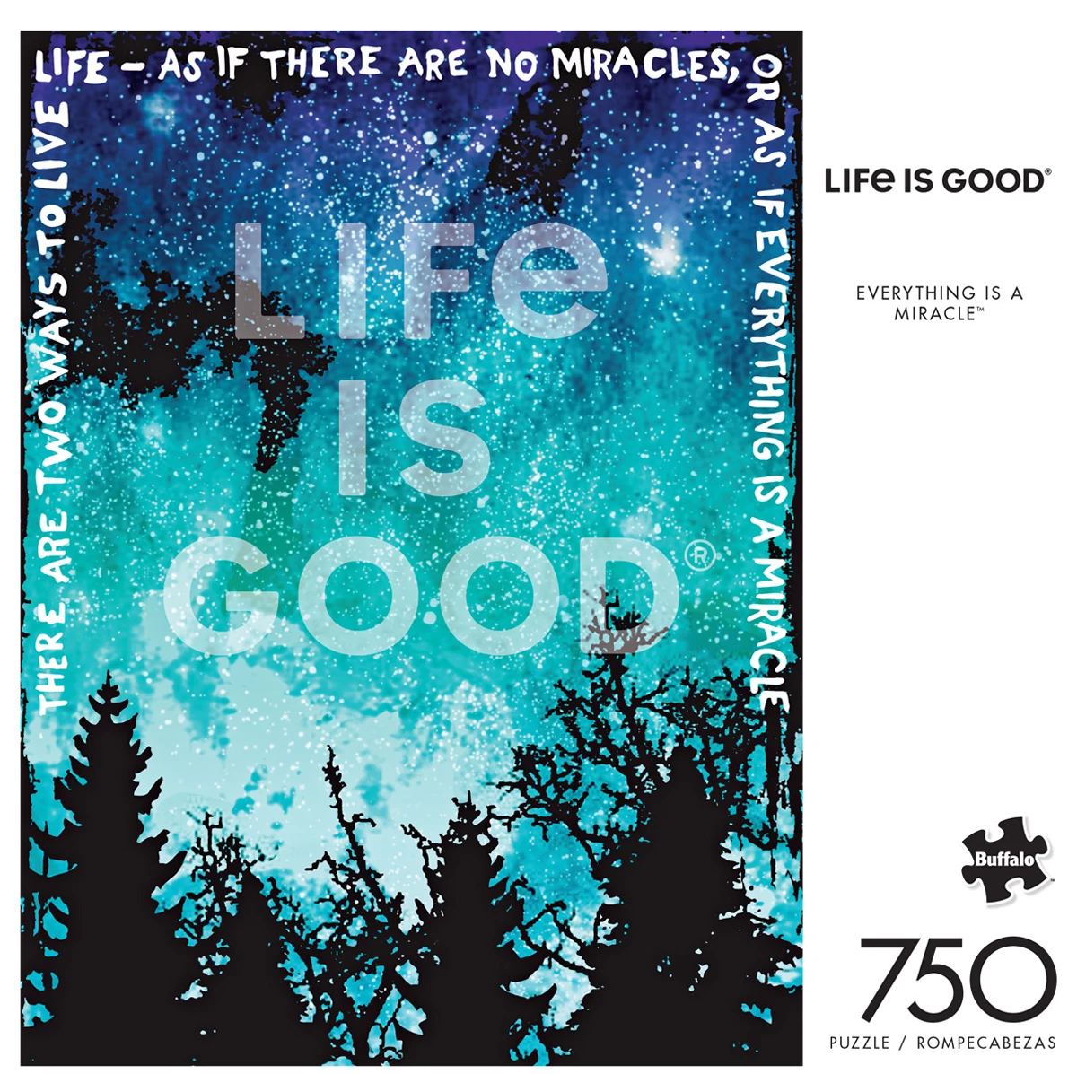 This 750-piece jigsaw puzzle, Life is Goodยฎ: Everything is a Miracleโข, is by Buffalo Games. Inspired by Life is Good and its mission to spread the power of optimism through artwork, this puzzle features a beautiful, blue starry-night sky and pine treesโreminding all puzzle-doers that everything can be a miracle.
