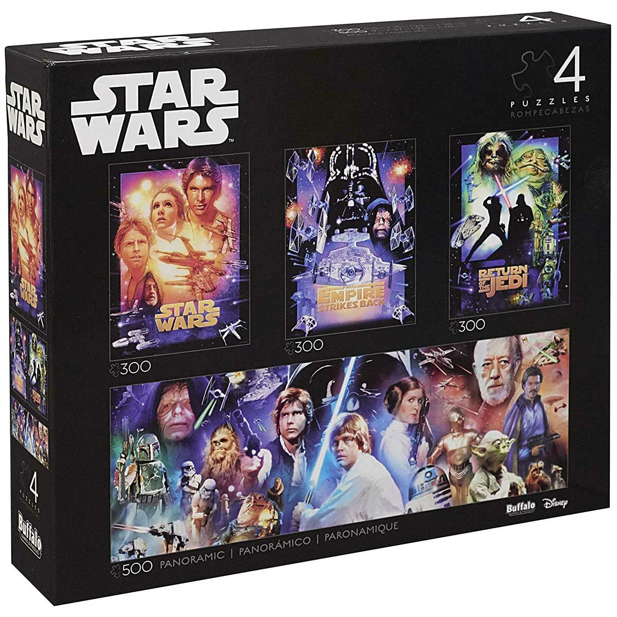 Four individual puzzles of your favorite Star WarsTM movie franchise characters are now available in one convenient multipack! This 4-in-1 multipack includes one 500-piece panoramic jigsaw puzzle and three 300-piece jigsaw puzzles.Β