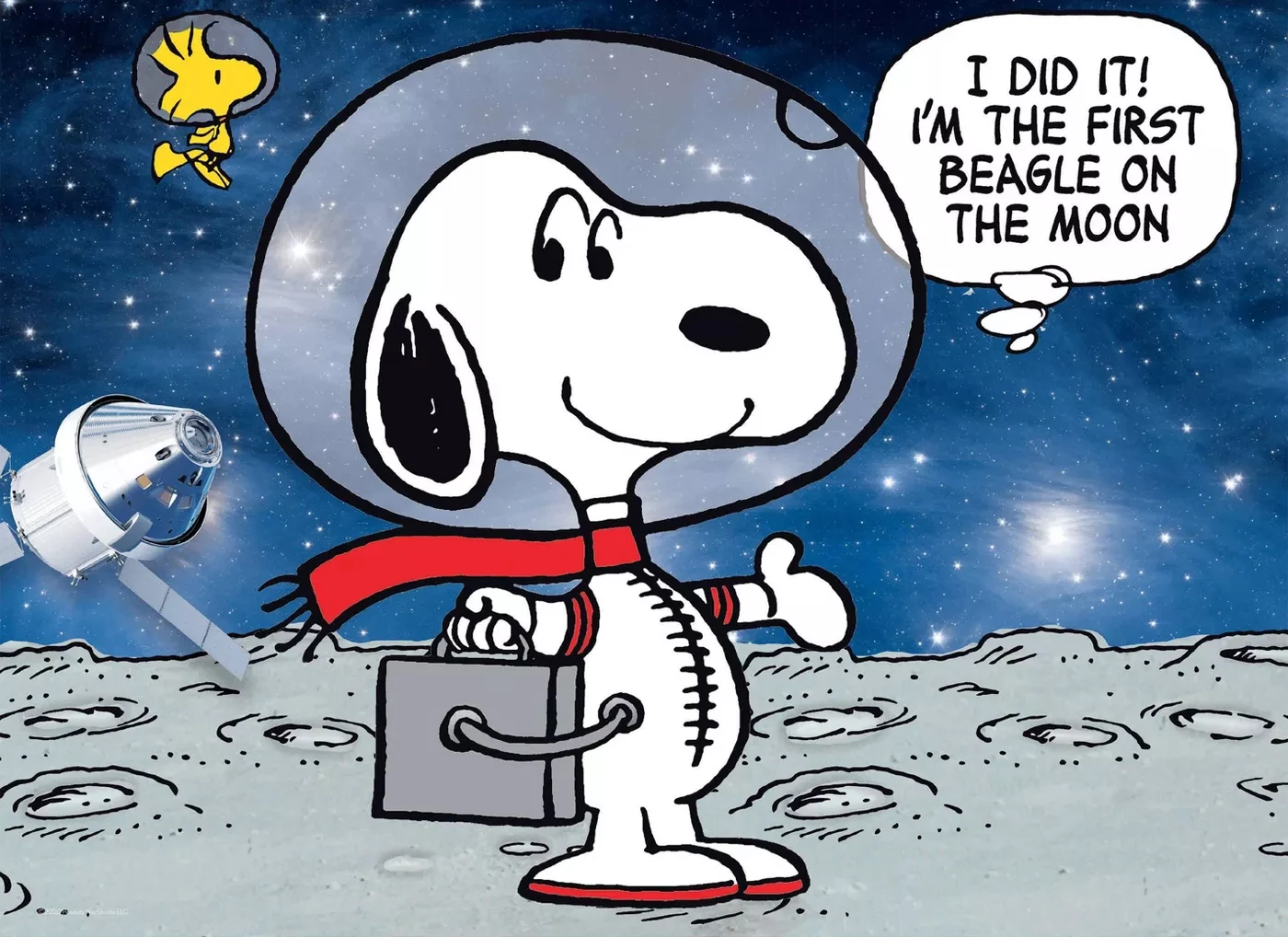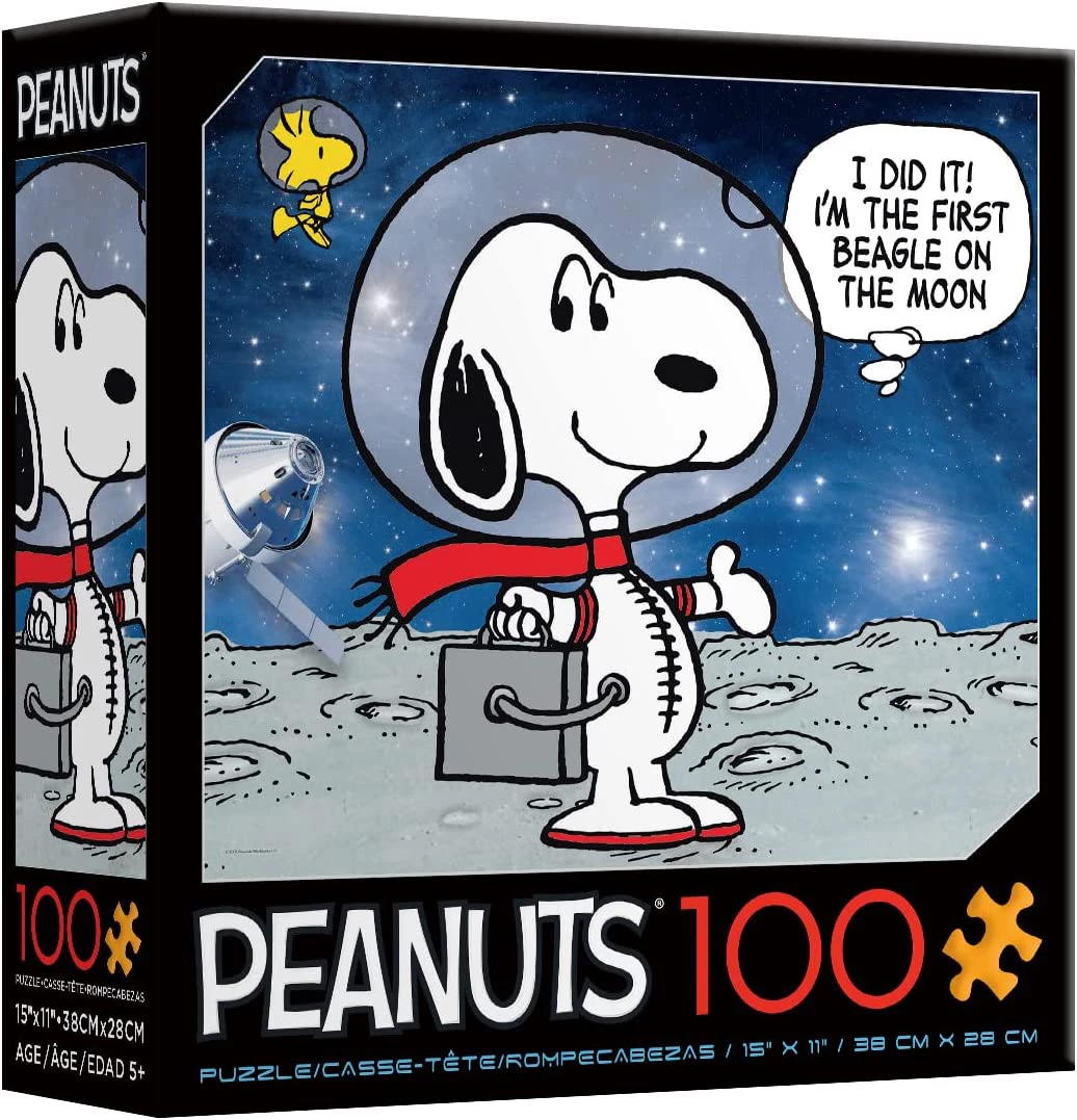 This 100 piece Ceaco Peanuts puzzle features a Snoopy and Woodstock in space suits on the moon. 15″ x 11″ when completed. Made in the USA.