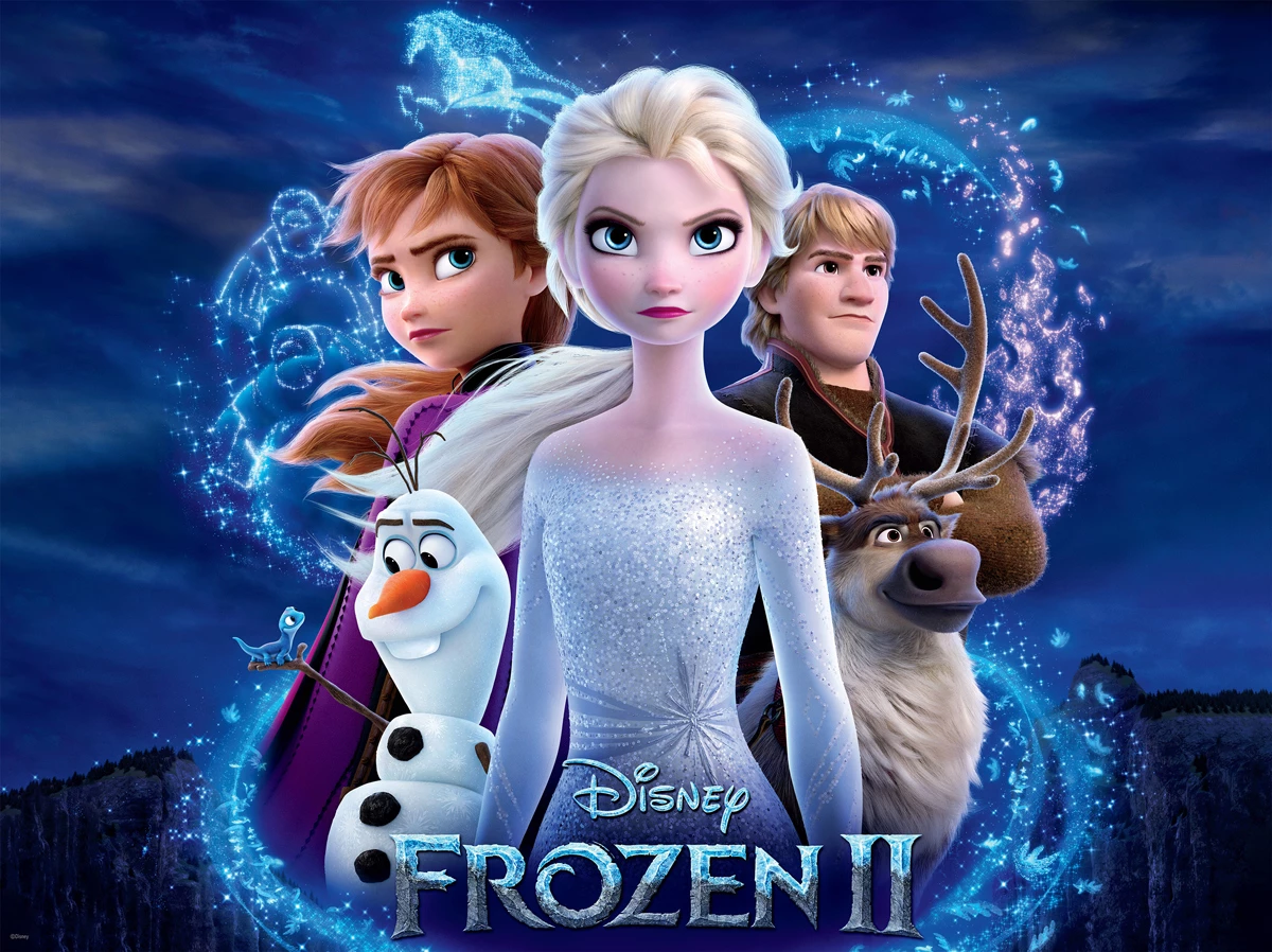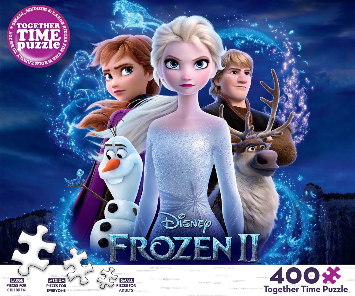 This 400 piece puzzle features the cast of the Disney movie Frozen 2. It includes three piece sizes, large for kids, medium for everyone and small for the adults. The completed puzzle measures 24″ x 18″.