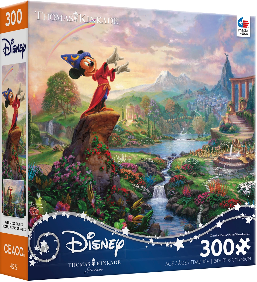 Thomas Kinkadeβs Disney Collection is a group of paintings inspired by great moments from famous Walt Disney movies this 300 oversized piece puzzle features Mickey Mouse from the movie Fantasia. The puzzle measures 24″ x 18″.Β