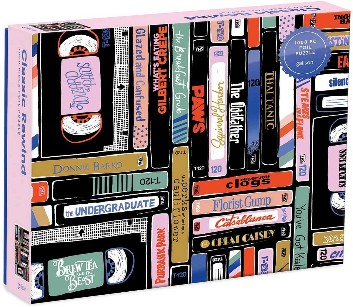The Classic Rewind 1000-piece jigsaw puzzle from Galison is just the right level of challenge for a few days of activity The box includes an insert with the full puzzle image for reference. This flawless fit jigsaw puzzle features stacks of bygone VHS tapes with humorous movie titles Embellished with shiny blue foil details, this makes an ideal gift for any puzzle lover! The completed puzzle measures 20” x 27″ and the package measures 825” x 1125” x 2″