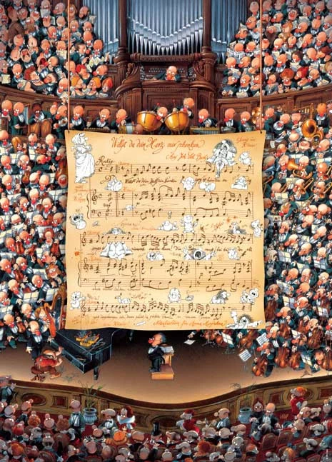 Cartoon 1000 piece jigsaw puzzle from Heye. Loup is an illustrator and cartoonist known for his art with amazingly constructed pictures with lots of detail, which present hard facts of life in a mercilessly funny way. He won the first prize for political caricature and his current book talks about modern art using black humor. Measures about 19″ x 27″ when complete. Released 2013.