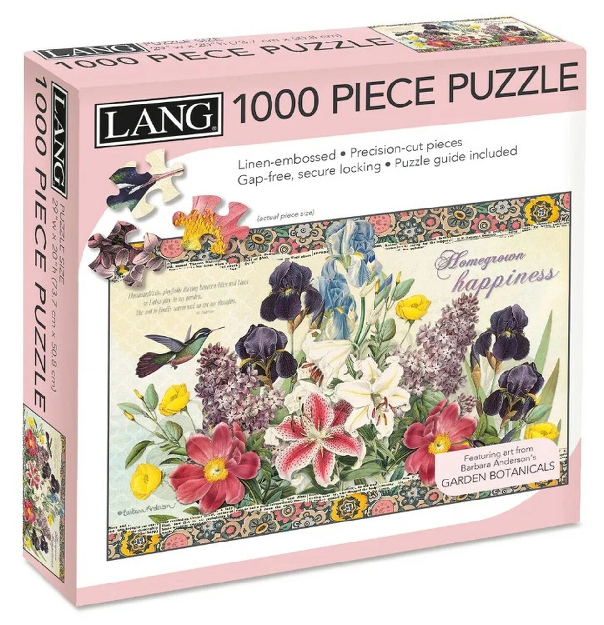 LANG jigsaw puzzles are a fun and challenging activity to do with friends and family! Tackle the Garden Botanicals 1,000-Piece Puzzle, featuring artwork by Barbara Anderson. Each puzzle piece is finished with linen-embossed paper so the completed piece looks like one large canvas! If you get stumped, an art guide print is included to help you out.
