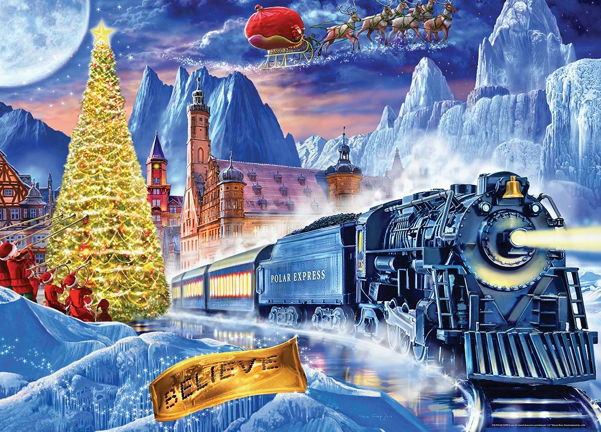 Travel into the popular movie Polar Express as you assemble this 1000 piece jigsaw puzzle. The MasterPieces puzzle displays great depth and colors that help creates the scene from the film to come to life as the illustration features a mountain of snow, Christmas tree and Santa flying across the sky. This 26.75″ x 19.25″ image is perfect to bring the holidays into any space.