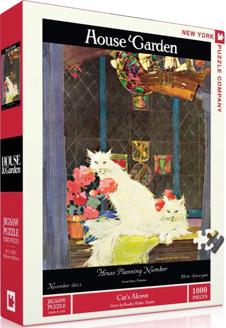 Two white cats gather in an alcove decorated with flowers, stained glass, and model boats in this 1000 piece puzzle.