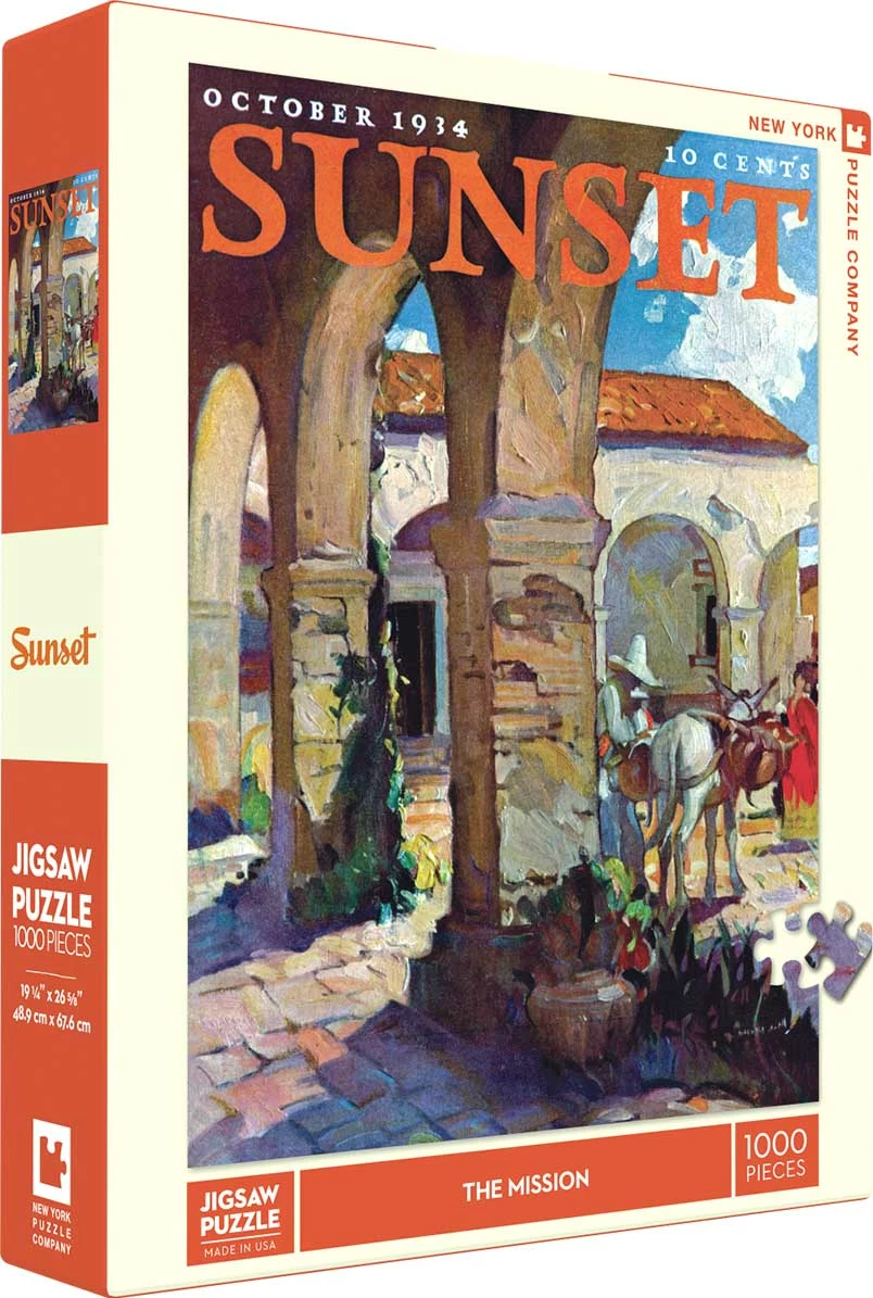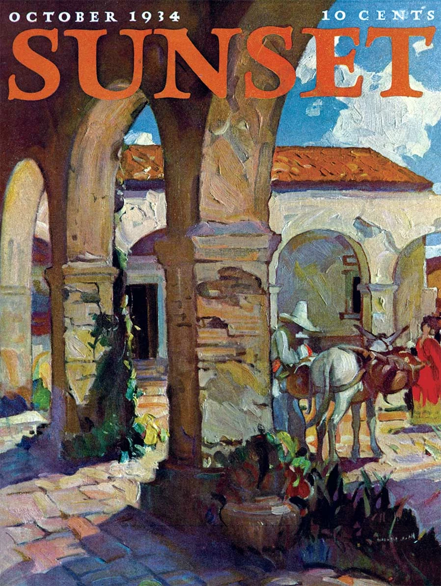 Cover rendering of Sunset magazine from October, 1934. Bucolic painted image of a southwestern mission style courtyard. In view is a southwestern Spanish attired male with a wide brimmed hat alongside a burro.