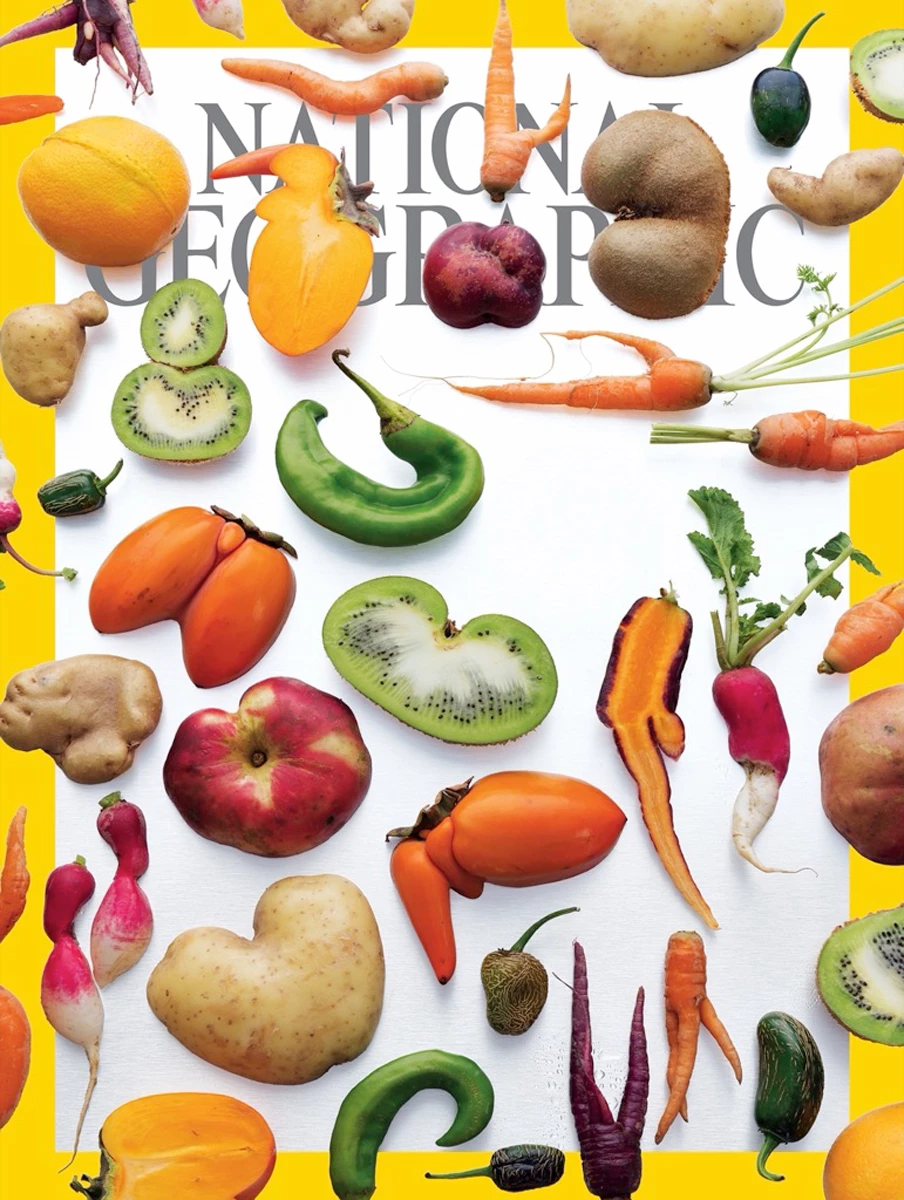This National Geographic cover captures “ugly food.” The photograph supported the feature article that examined food waste, including unharvested and unsold fruits and vegetables that get tossed due to aesthetic reasons.