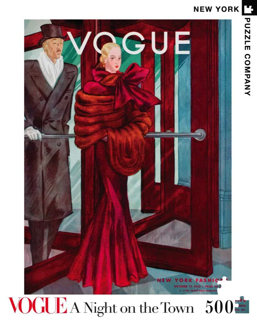 In this 500 piece jigsaw puzzle from New York Puzzle Company, a classic cover of an issue of Vogue is beautifully recreated, featuring a fashionable woman heading out on the town.