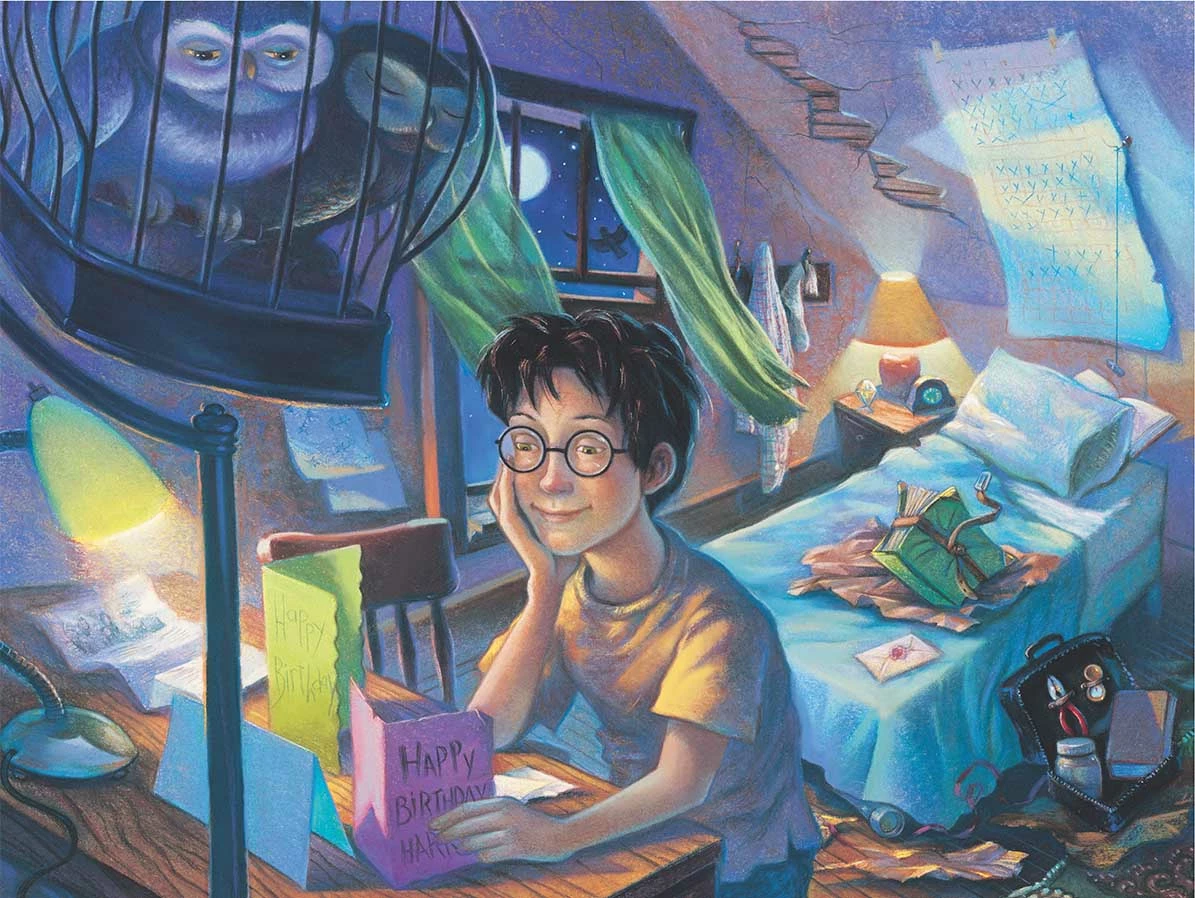 Harry Potter can’t wait for his summer vacation with the Dursleys to be over so he can get back to his beloved Hogwarts School of Witchcraft and Wizardry. His pet owl Hedwig looks on as Harry reads birthday cards from his friends Hermione and Ron while exciting adventures await him just outside his window!