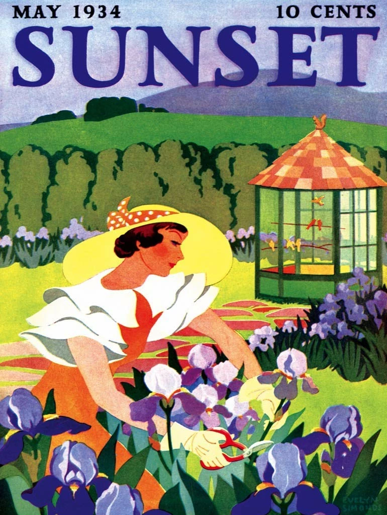 From the cover of Sunset Magazine in 1934, Evelyn Simonds paints a colorful scene of a lovely lady in a broad brimmed hat tending to her garden of irises, with an aviary and hills in the background.