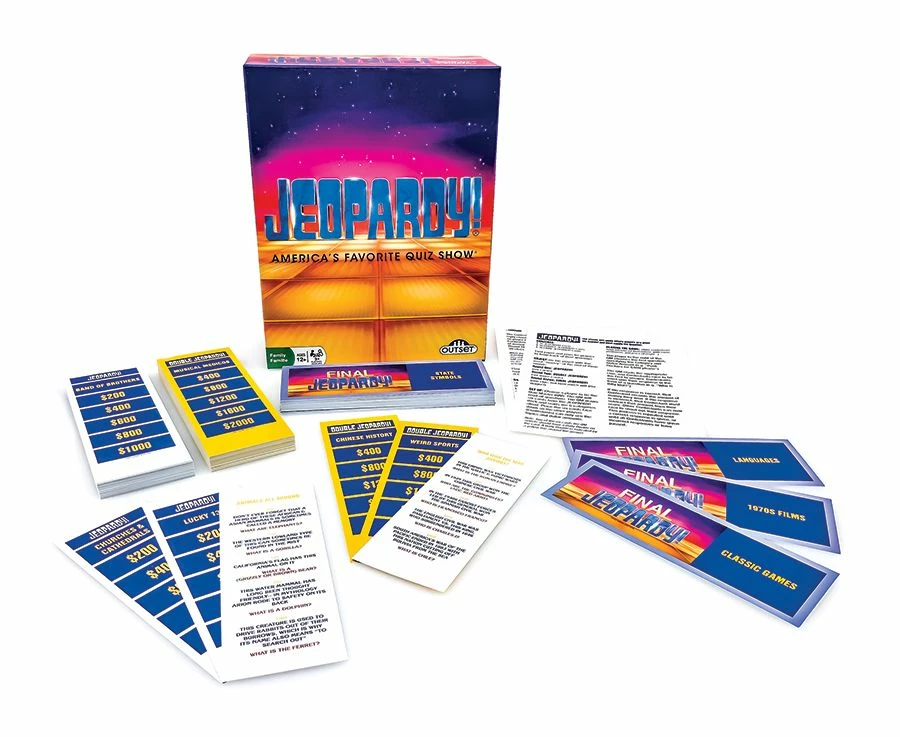Jeopardy!ยฎ Card Game puts the big fun of Jeopardy into a small package to take on the road. ย The card game features exclusive content not contained in the big box board game.