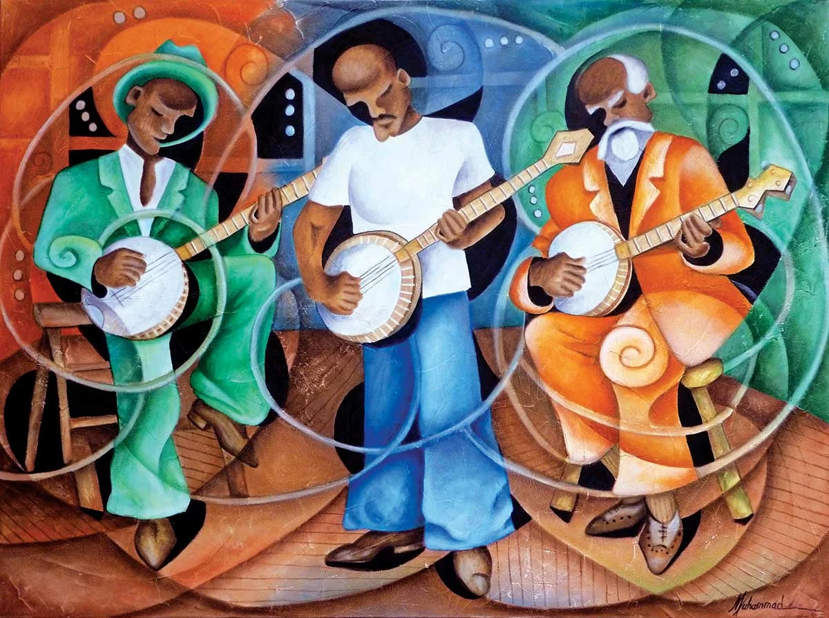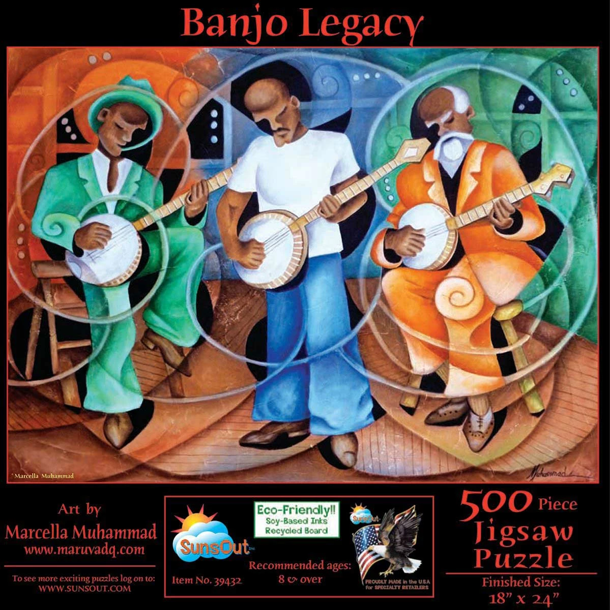 In this 500 piece jigsaw puzzle from Sunsout, three musicians of varying ages strum away on the Banjo, showcasing the storied legacy this instrument holds. This puzzle features artwork from Marcella Muhammed. The completed puzzle will be 18″ x 24″.