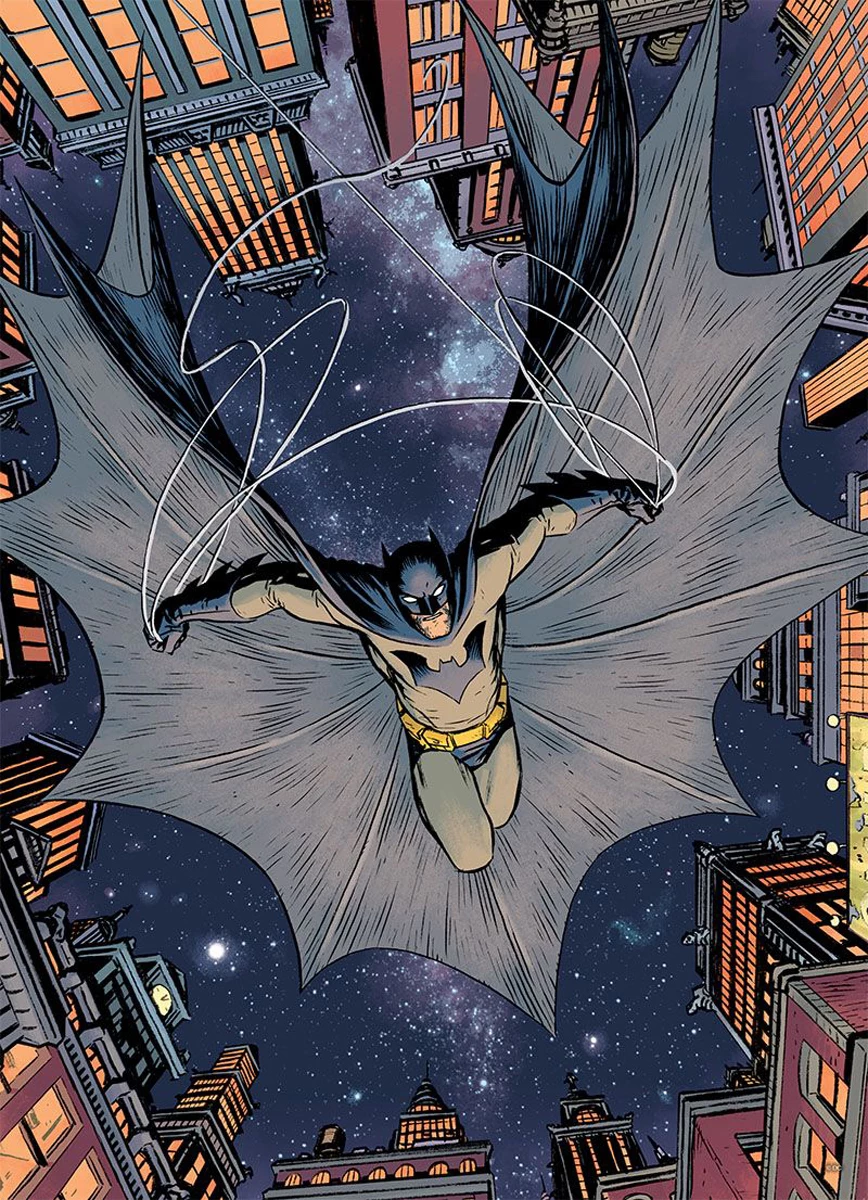 A fierce and unfurled Batman descends from Gotham City heights in this 1,000-piece jigsaw puzzle featuring a retro comic-style Caped Crusader centered amidst towers and a starry sky.