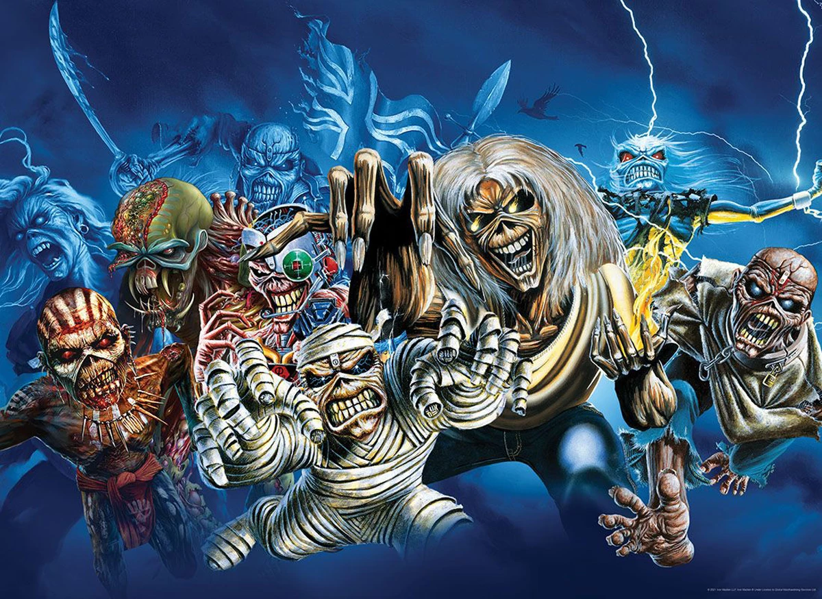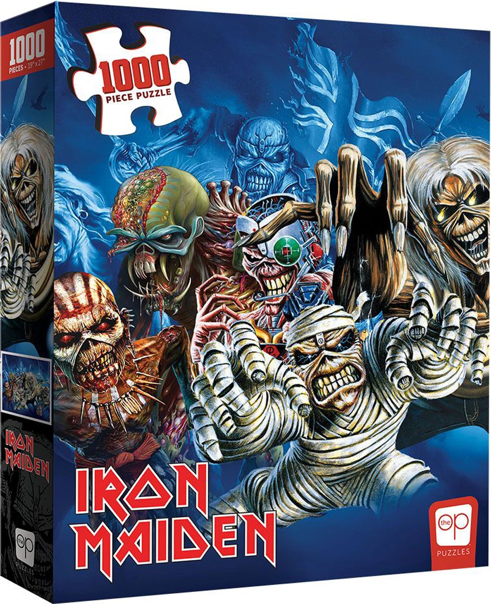 English heavy metal band Iron Maidenβs famous mascot fiercely abounds in βThe Faces of Eddieβ, a 1,000-piece jigsaw puzzle for fans and collectors to find his fiendish grin among a collection of his various appearances. The completed puzzle measures 19.25″ x 26.6″.