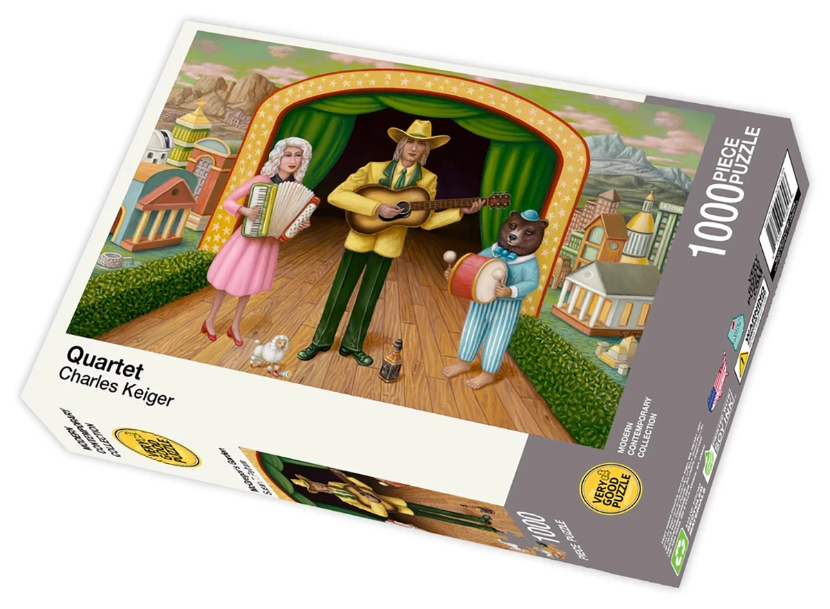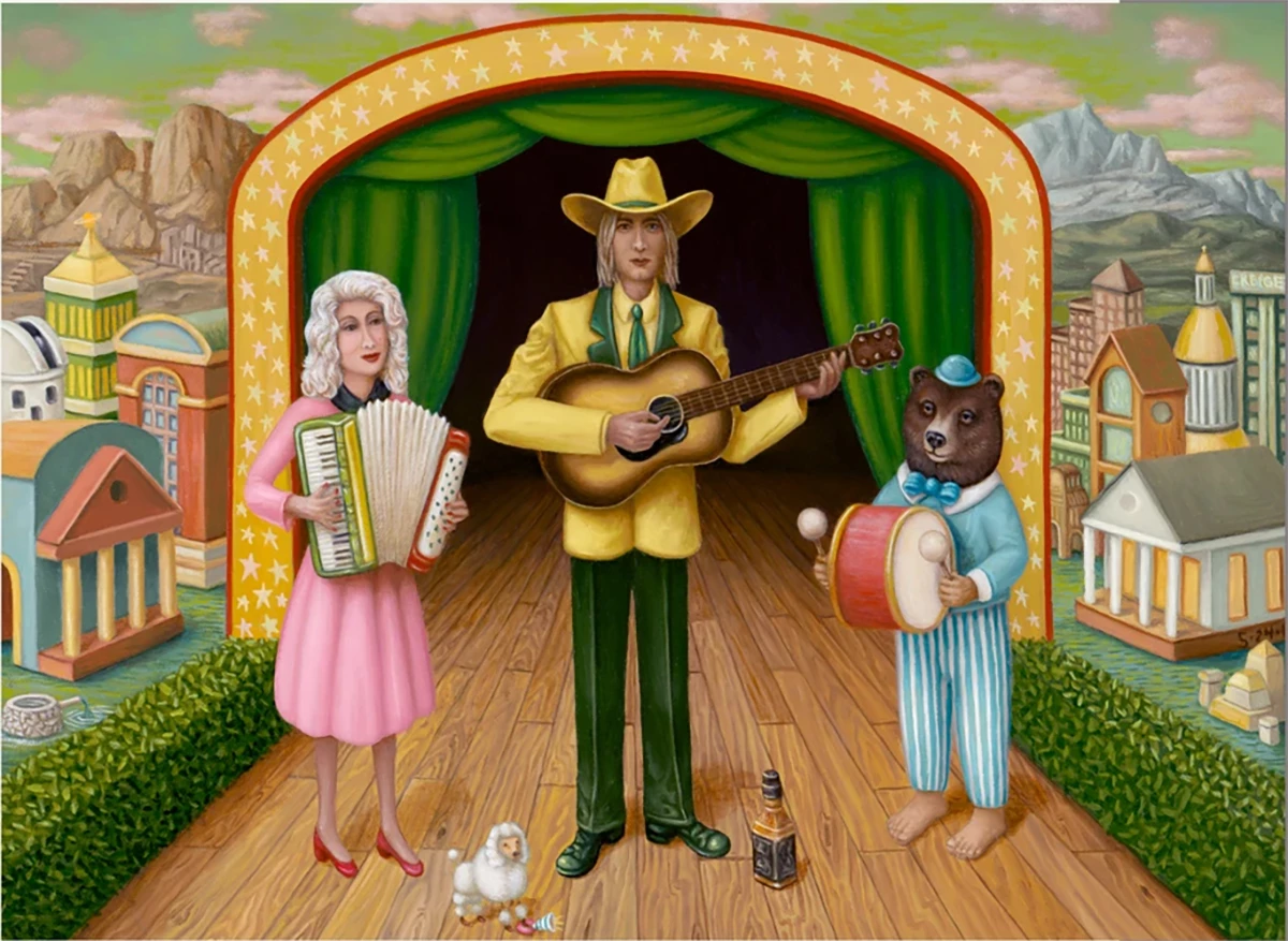 Charles Keiger’s “Quartet” presents a set of four musicians: a woman in a pink dress with an accordion, a long-haired man with a guitar, a bear holding a drum and, the hardest to notice, a toy poodle stepping on a horn. They stand on a proscenium, with a bunch of Memphis-style architecture and some faraway mountains in the background, rosy clouds in the sky that are as artificial as any stage background. A bottle of whiskey sits on the ground. The artist admits to René Magritte as a strong influence, and although Keiger’s surrealism feels gentler and more cheerful, there are similarities: the clouds, the preoccupation with doubling, the people moved around like paper dolls.